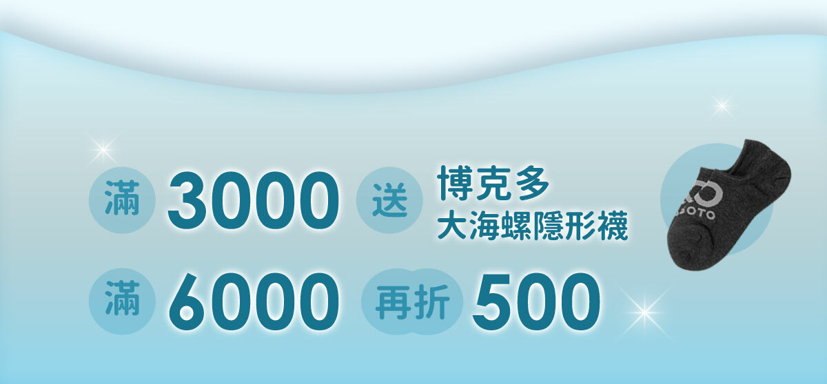 全店滿額送-滿3000送博克多大海螺隱形襪,滿6000再折500