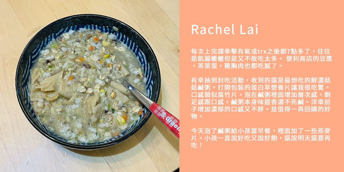 不論是飽滿穀物、鮮脆蔬菜的咀嚼感,鮮甜粥底,或是清香軟Q的蛋白萃,這些都是好吃的祕密!哦對了,它還是素食者能吃的。除了香菇口味是「全素」以外,其他兩個都是「奶素」。