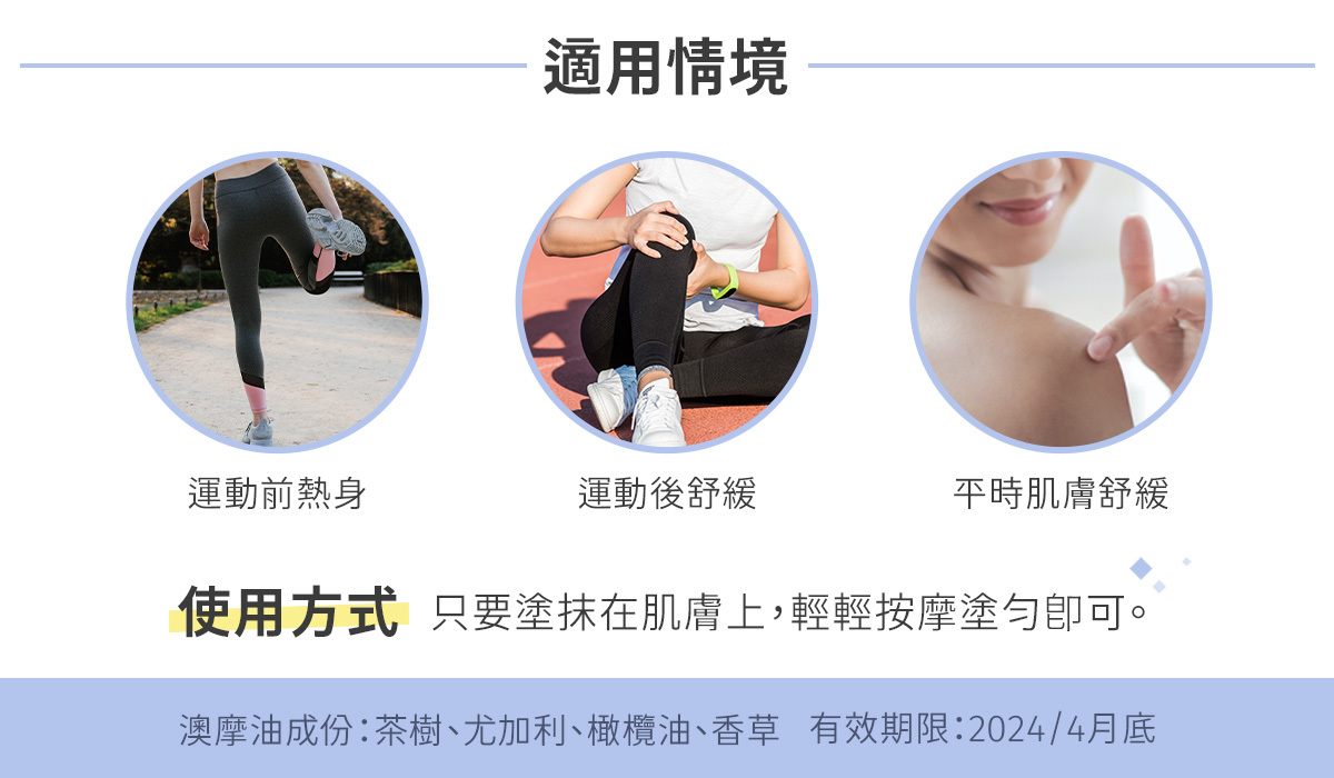 走了一天後,在你想要舒緩緊繃的肌肉部位或是關節處,滾一下這瓶澳摩油,再穿上組合裡的「膝蓋恢復套」,第二天醒來就能帶著一顆堅定的心,精神飽滿的身體,啟程踏步繼續向前行。