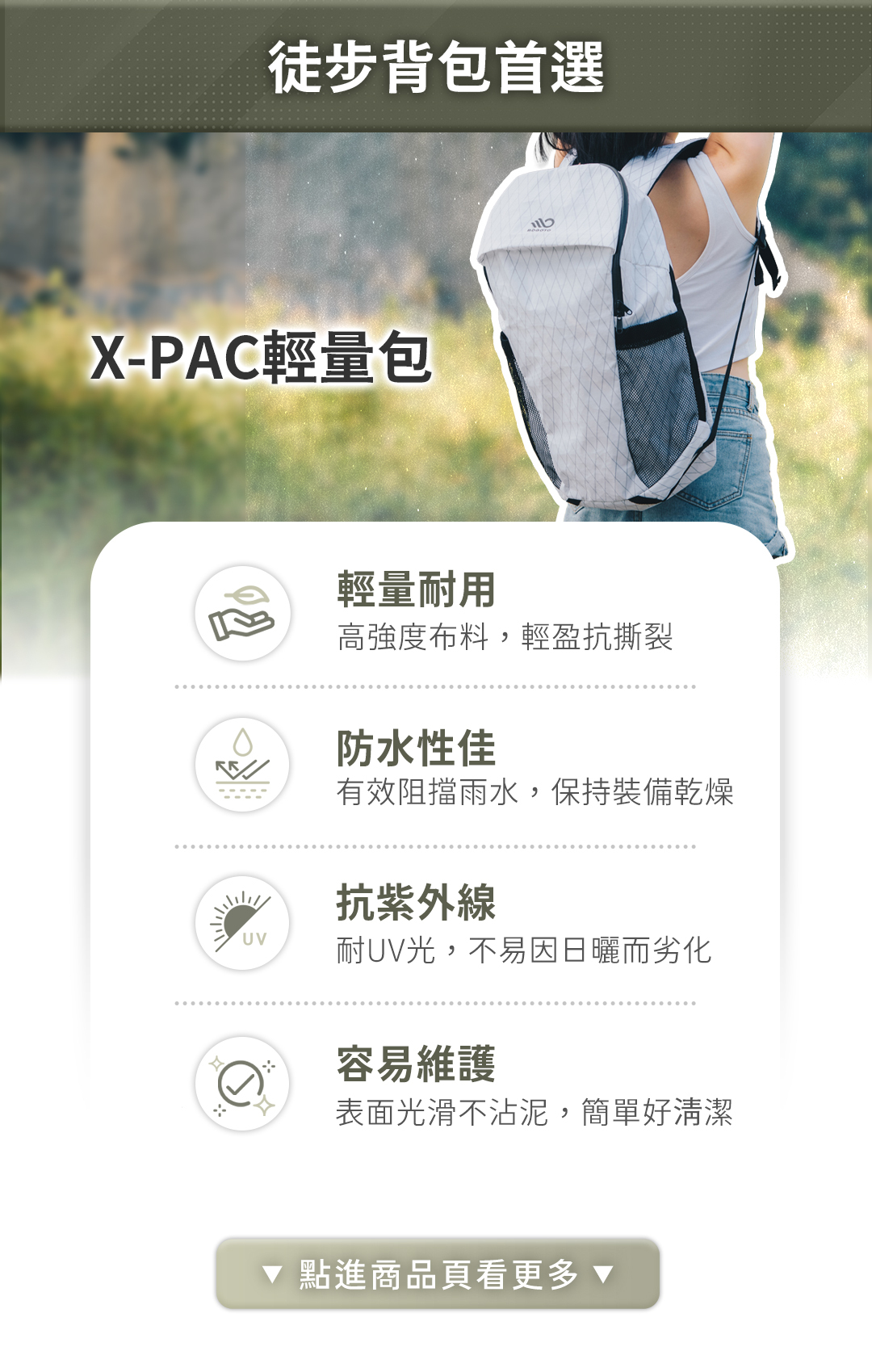 X-PAC輕量包,採用 輕量、防水、耐用 的高科技布料,