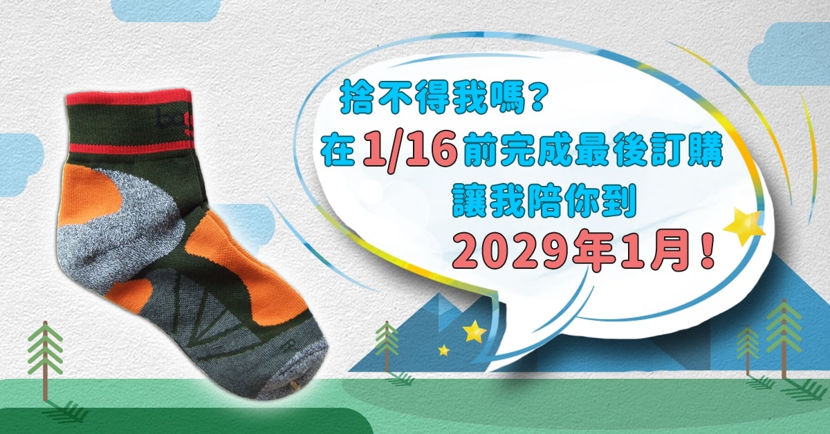 2017年底我們停售了馬拉松專用襪,2018年8月也悄悄下架了越野爬山襪。但卻陸陸續續一直收到客人詢問:『爬山襪怎麼不見了?』、『應該要像馬拉松襪那樣通知一下吧!』、『我先生只穿這雙誒!』...於是我們決定為了這些老朋友,再上架賣最後一週!讓十年保固的越野爬山襪陪你們到2029年!