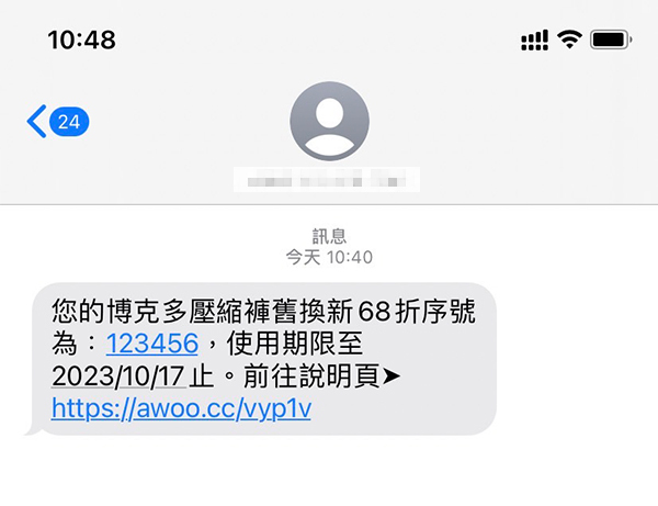 第二步:我們收到您的舊壓縮褲後,會以手機簡訊傳送 壓縮褲68折序號 給您。