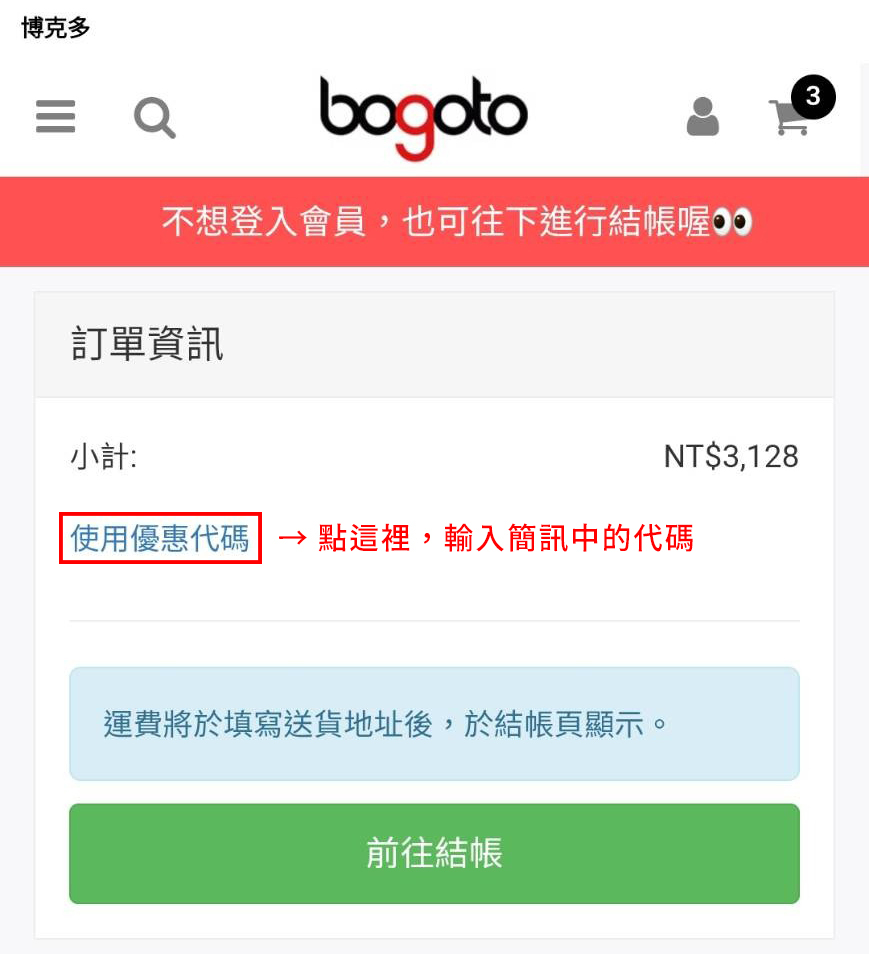點擊下方85折老朋友商品頁連結,選擇尺寸並加入購物車。點擊「使用優惠代碼」欄位並輸入折扣序號,確認購物車中出現 洗護×續航支援包 後,即可前往結帳。