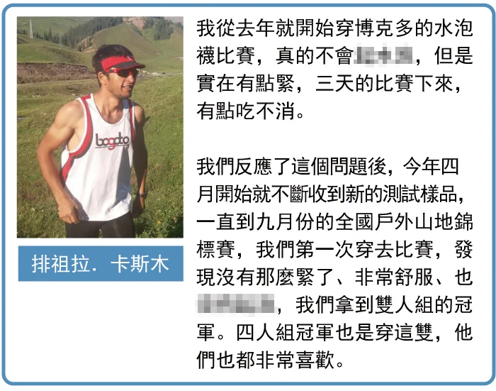 博克多的測試員,針對各式各樣的地形、地貌;從一般小雨到傾盆大雨;距離從42公里到168公里;跑步時間最長達39小時(2015 UTMF) 不斷反覆的測試、修改、再測試、再修改,才完成了"起水泡就退錢"的第一代博克多水泡襪。