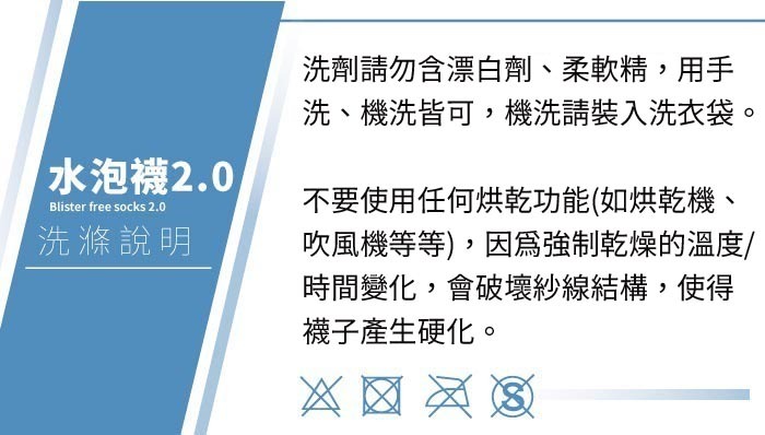 一代水泡襪建議穿著時間是3小時,並依照個人情況延長或縮短, 對於一般跑者練習時足夠,但長時間、長距離的馬拉松、超馬或越野、登山時則受限於穿著時間而無法使用。二代水泡襪經改良後,穿著時間可長達30小時。
