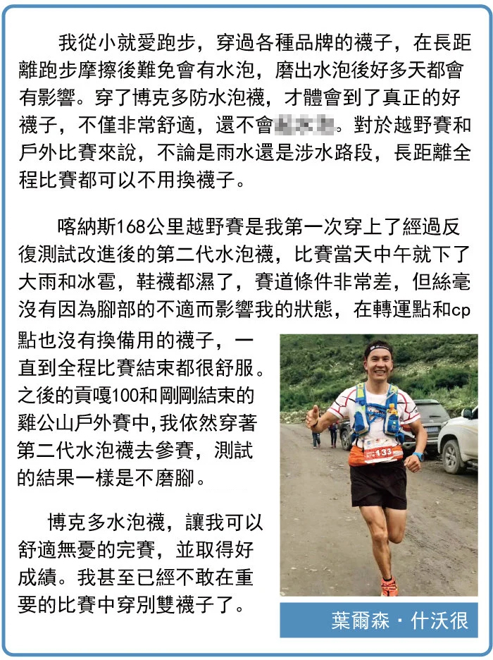 博克多的測試員,針對各式各樣的地形、地貌;從一般小雨到傾盆大雨;距離從42公里到168公里;跑步時間最長達39小時(2015 UTMF) 不斷反覆的測試、修改、再測試、再修改,才完成了"起水泡就退錢"的第一代博克多水泡襪。