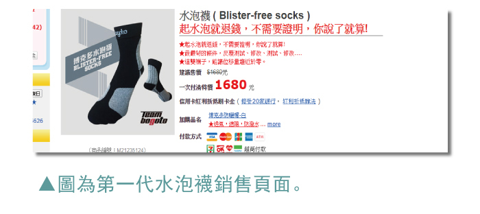 一代水泡襪售價1680元/雙,為使更多有水泡困擾的人能安心運動,二代水泡襪從編織方法和機器改良,售價降低至680元/雙。